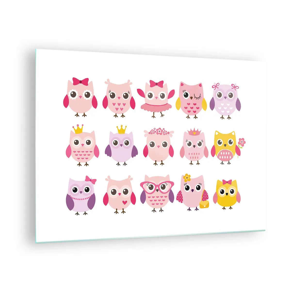 Obraz na skle - Barevné sovy v různých vzorech na bílém pozadí - 70x50cm - Jedna sladší než druhá - Moderní nástěnná dekorace do obývacího pokoje a ložnice ARTTOR