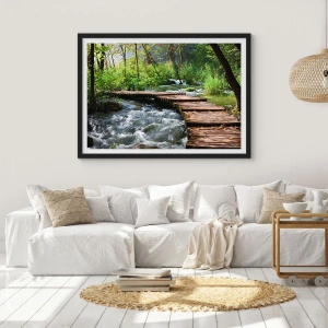 Plakát v černém rámu - Dřevěný most přes zurčící potok - 50x70cm - U zpěněného vodopádu - Moderní nástěnná dekorace do obývacího pokoje a ložnice ARTTOR