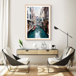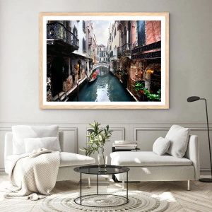 Plakát v rámu světlý dub - Benátská krajina s gondolou a můstkem - 60x60 cm