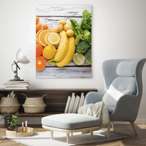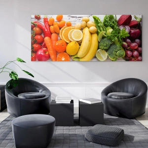 - Tento skleněný obraz zobrazuje barevné ovoce a zeleninu uspořádané na dřevěném stole. Je perfektní dekorací do kuchyní a jídelen, přináší svěžest a harmonii do přírody.