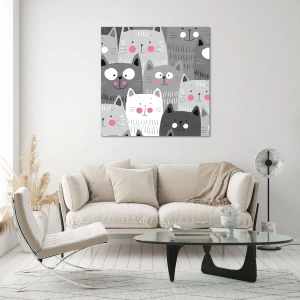 "Kočičí svět" je skleněný obraz, který zobrazuje skupinu zábavných koček v jemných šedých barvách na bílém pozadí. Přátelské výrazy obličeje koček a jejich rozmanité tvary vytvářejí přátelskou a radostnou atmosféru, která rozzáří každý interiér.