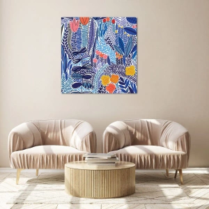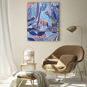 - Tento skleněný obraz zobrazuje tropickou zahradu s exotickými rostlinami a květinami v zářivých barvách. Je ideální do interiérů inspirovaných přírodou a exotikou a dodává prostoru svěží a jedinečný charakter.