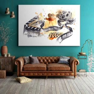 - Tento obraz zobrazuje filmové motivy, jako je filmový pás, fotoaparát a klapka, v uměleckém akvarelovém stylu. Stylový doplněk pro milovníky filmu a nadšence do jedinečných dekorací.