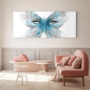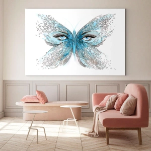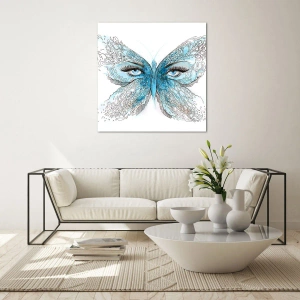 Obraz na skle - Motýl s modrými křídly a lidskýma očima v uměleckém stylu. - 70x50cm - Sýkora modřinka eros - Moderní nástěnná dekorace do obývacího pokoje a ložnice ARTTOR