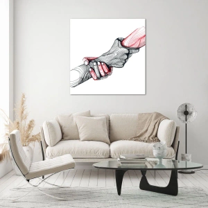 Abstraktní forma a symbolické znázornění dvou rukou činí tento obraz plný emocí a dodávají prostoru jedinečný charakter. Je to perfektní volba pro ty, kteří oceňují umění inspirující k zamyšlení nad mezilidskými vazbami.