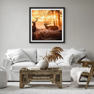 Plakát v černém rámu - Jelen v paprscích vycházejícího slunce na pozadí lesa - 50x70cm - Sen myslivce - Moderní nástěnná dekorace do obývacího pokoje a ložnice ARTTOR