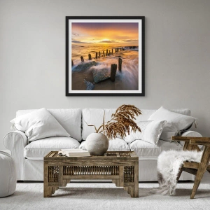 Plakát v černém rámu - Západ slunce nad mořem s dřevěnými tyčemi na pláži - 50x70cm - Drsná krása Baltského moře - Moderní nástěnná dekorace do obývacího pokoje a ložnice ARTTOR