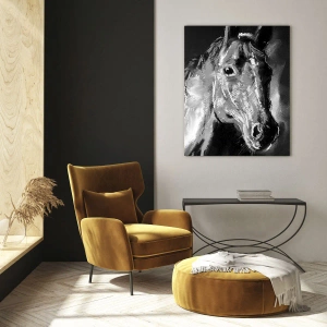 - Tento obraz zobrazuje portrét koně v odstínech černé a bílé na tmavém pozadí. Ideální jako moderní dekorace do stylových interiérů.