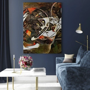 Barvy obrazu zahrnují teplé odstíny hnědé, oranžové a žluté, které kontrastují s bílou a černou a dodávají kompozici dynamický charakter. Detaily obrazu, jako jsou přesné linie a geometrické tvary, vzbuzují zájem a povzbuzují k delšímu zkoumání. Toto je umění, které inspiruje a přitahuje pozornost.
