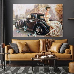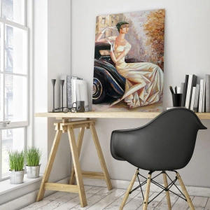 - Tento obraz v retro stylu zobrazuje elegantní ženu u klasického auta v městském prostředí. Tato decentní kompozice s nádechem nostalgie se skvěle hodí do obývacího pokoje nebo ložnice.