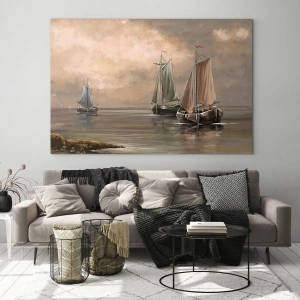 - Obraz zobrazuje tři plachetnice plující po klidném moři, obklopené jemnými mraky. Jemné pastelové odstíny a odlesky na vodě dodávají kompozici nostalgický a romantický nádech.