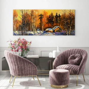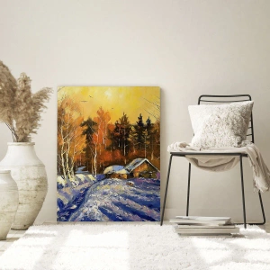 - Obraz zobrazuje malebnou zimní krajinu s dřevěnou chaloupkou obklopenou sněhem. Teplé světlo zapadajícího slunce dodává scéně magický a nostalgický nádech a zdůrazňuje klid přírody.