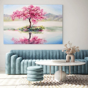 Nástěnný obraz - Svěcení jara - Růžový strom na ostrově zrcadlící se v klidné vodě