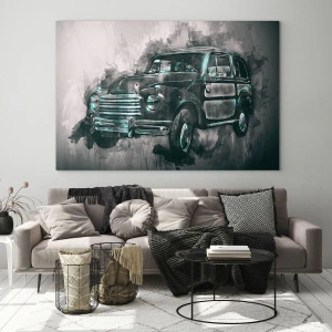 - Tento obraz starého auta v retro stylu se vyznačuje šedým pozadím a tyrkysovými akcenty. Je perfektním doplňkem do industriálních nebo vintage interiérů, kterým dodá jedinečnou atmosféru.
