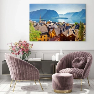 - Tento skleněný obraz zobrazuje malebné jezerní městečko obklopené horami. Perfektní motiv pro interiéry inspirované přírodou a cestováním.