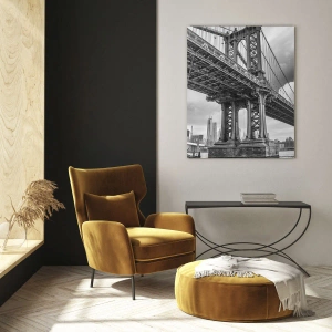 V pozadí jsou viditelné newyorské mrakodrapy, které dodávají mostu městský kontext a dynamiku. Detail ocelové konstrukce mostu je zvýrazněn jemnými kontrasty, díky čemuž je obraz poutavý a inspiruje k obdivu pro svou technickou preciznost a harmonický design.