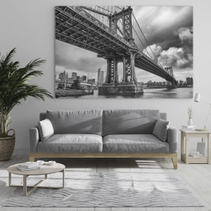 - Monumentální visutý most v černé a bílé barvě s výhledem na newyorské mrakodrapy. Dokonalá rovnováha mezi uměním a architektonickou precizností.