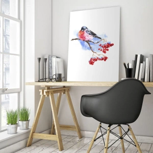 "Zima v barvách" je unikátní obraz, který upoutá pozornost svou jemností a uměleckým vyjádřením. Ilustrace zobrazuje ptáka sedícího na větvi jeřábu ozdobeného červenými plody. Akvarelové styly použité v tomto díle dodávají celku jemný charakter a lehkost. Barvy, včetně jemných odstínů modré a červené, činí obraz dokonale vhodným do skandinávských nebo minimalistických interiérů.