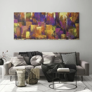 - Skleněný obraz o rozměrech 70x50 cm představuje abstraktní vizi metropole v teplých barvách, obohacenou o fialové akcenty, které vytvářejí jedinečnou atmosféru.