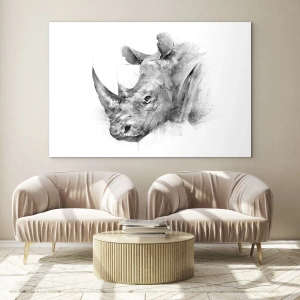 - Tento skleněný obraz zobrazuje umělecký portrét nosorožce v černé a bílé barvě. Jeho expresivní styl a elegance dokonale podtrhují jedinečnost této dekorace v minimalistickém interiéru.