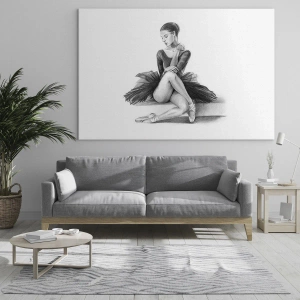 - Jemná skica zobrazující baletku v černých šatech, sedící v zamyšlené póze. Černobílá kompozice zdůrazňuje eleganci a jemnost postavy a vytváří jedinečnou atmosféru. Ideální volba pro interiéry plné noblesy a uměleckého vyjádření.