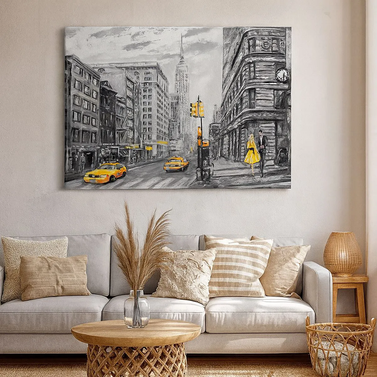 Pokud hledáte dekoraci, která kombinuje městský charakter s uměleckou elegancí, bude plátěný tisk **„Newyorská ulice se žlutými akcenty“** vynikající volbou.