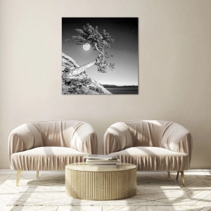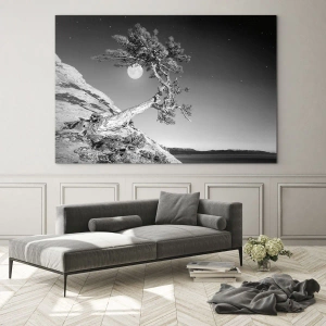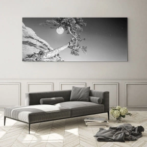 - Černobílý obraz zobrazuje osamělý, pokroucený strom rostoucí na svahu skalnaté hory. V pozadí je vidět úplněk, který vytváří pozoruhodně poetickou a symbolickou noční krajinu, naplněnou klidem a silou.