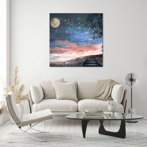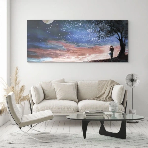 - Romantický obraz zobrazující zamilovaný pár pod hvězdnou oblohou, s měsícem a pohádkovou krajinou v pozadí. Dekorace plná emocí, ideální do interiérů s duší.