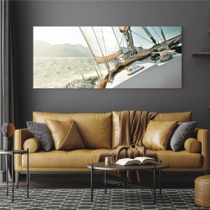 Obraz Pod plnými plachtami zobrazuje dynamickou scénu z paluby jachty plující po rozbouřeném moři. Detailní záběr zachycuje detaily paluby, napjaté linie a plachty plné větru. V pozadí se táhnou hory a modrá obloha, které v kombinaci s jiskřivou vodou vytvářejí atmosféru plnou energie a svěžesti.