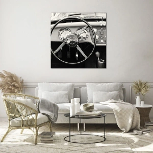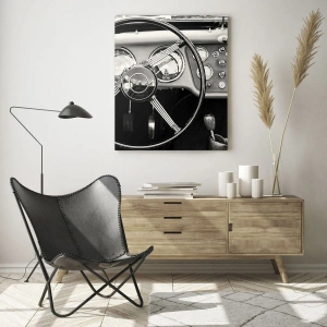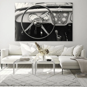- Tento černobílý obraz zobrazuje interiér klasického vozu s viditelným volantem a retro ukazateli. Mechanické detaily a sépiový odstín vytvářejí jedinečnou dekoraci pro automobilové nadšence a milovníky veteránů.