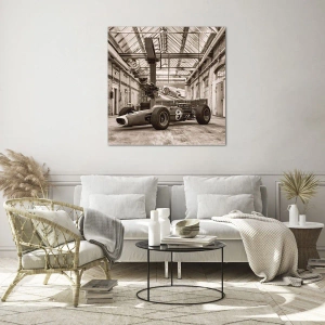 Obraz na skle - Veteránské závodní auto v průmyslové hale - 70x50cm - Odpočinek vítěze - Moderní nástěnná dekorace do obývacího pokoje a ložnice ARTTOR
