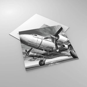 Skleněný obraz „Vždy připraveni k letu“ představuje majestátní letadlo s vrtulovými motory, zachycené v černé a bílé barvě. Perspektiva fotografie, zobrazující stroj zespodu, umocňuje dojem velikosti a síly vycházející z této legendární stavby. Kompozice, plná pohybu a dynamiky, přesto přesná a expresivní, přitahuje pohled a inspiruje. Pozadí, na kterém je zachycen pohyb mraků, umocňuje dynamiku obrazu a naznačuje blížící se vzlet letadla. Kombinace technické preciznosti a uměleckého zachycení vytváří vizi, která oslovuje estéty i technologické nadšence.