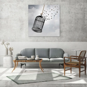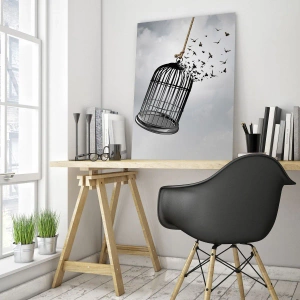 - Umělecká vize svobody, znázorněná ptáky létajícími z otevřené klece zavěšené proti obloze. Minimalistická kompozice vzbuzuje emoce a inspiruje k zamyšlení. Ideální dekorace do moderních a prostorných interiérů.