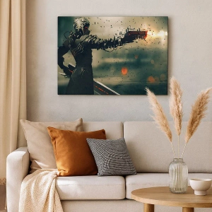 - Tento plátěný obraz o rozměrech 70x50 cm zobrazuje kybernetického bojovníka s futuristickými zbraněmi v dynamickém prostředí. Ideální do moderních interiérů a prostor inspirovaných technologiemi.