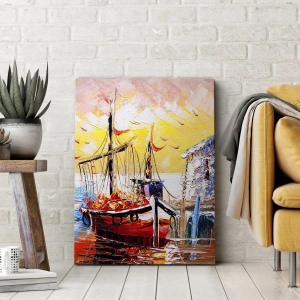 - Tento obraz zobrazuje malebný přístav s rybářskými loděmi při západu slunce. Teplé barvy a jemné světelné odrazy vytvářejí klidnou a atmosférickou kompozici, ideální pro interiérovou dekoraci.