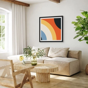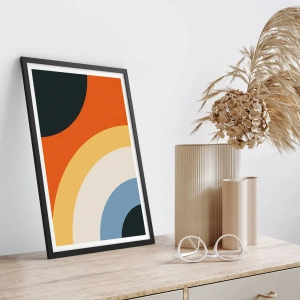 - Tento plakát zobrazuje abstraktní oblouky a kruhy v oranžové, žluté a modré barvě. Je ideální do moderních interiérů a má černý rám.