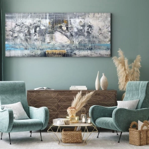 Barevnost obrazu je založena na klidných, chladných odstínech, které vytvářejí atmosféru relaxace a klidu. Nepravidelné tahy štětcem a texturní detaily dodávají kompozici hloubku a uměleckou expresivitu. Je to perfektní volba pro ty, kteří oceňují minimalistické nástěnné dekorace a jemnou eleganci.