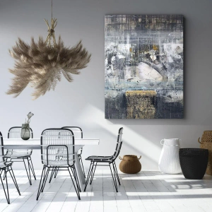 Obraz „Abstraktní kompozice v chladných tónech“ je umělecké dílo, které přitahuje pozornost svou jemnou, ale dynamickou estetikou. Zobrazuje abstraktní kompozici, v níž dominují chladné tóny šedé a modré, proložené jemnými akcenty zlaté. Toto dílo vnáší do interiéru harmonii a moderní charakter.