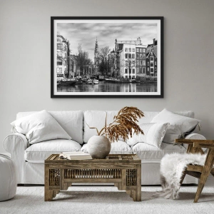 „Amsterdamská atmosféra“ je plakát zobrazující černobílý pohled na okouzlující městský kanál, kterému dominuje majestátní historická věž. Tato kompozice dokonale zachycuje atmosféru evropských měst a kombinuje eleganci a nostalgii.
