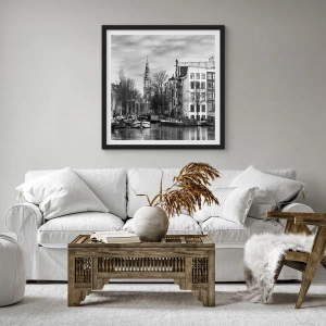 Plakát v černém rámu - Černobílý pohled na kanál s historickou věží v pozadí. - 50x70cm - Amsterdamské vibrace - Moderní nástěnná dekorace do obývacího pokoje a ložnice ARTTOR