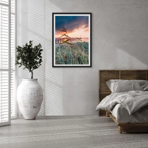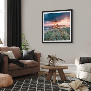 Plakát v černém rámu - Molo u moře obklopené trávou při západu slunce - 50x70cm - Neodváto větrem - Moderní nástěnná dekorace do obývacího pokoje a ložnice ARTTOR
