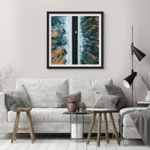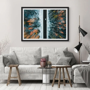 Plakát v černém rámu - Pohled z ptačí perspektivy na zimní les s cestou a jediným autem - 50x70cm - Přes zimní les - Moderní nástěnná dekorace do obývacího pokoje a ložnice ARTTOR