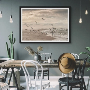 Plakát v černém rámu - Rackové vznášející se nad pobřežím pod zataženou oblohou - 50x70cm - Šumění moře, zpěv ptáků - Moderní nástěnná dekorace do obývacího pokoje a ložnice ARTTOR