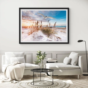 „Vítr z moře“ je krásný plakát zobrazující harmonii přírody v jedinečném prostředí. Pták v letu se majestátně vznáší nad travnatými dunami, zatímco v pozadí se táhne klidné moře, ozářené teplými paprsky zapadajícího slunce. Tato scéna navozuje atmosféru klidu a relaxace, ideální do obývacího pokoje, ložnice nebo kanceláře.