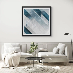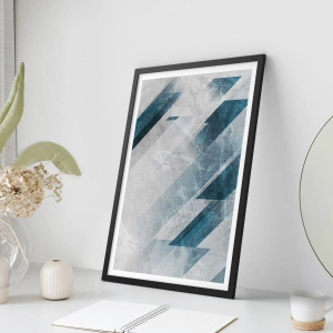 Plakát v černém rámu - Geometrie v odstínech modré a šedé - 50x70cm - Prostorová kompozice – pohyb šedé - Moderní nástěnná dekorace do obývacího pokoje a ložnice ARTTOR