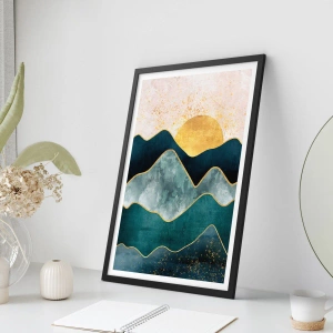 - Stylizovaná abstrakce hor v odstínech tmavě modré a zelené, s dominantním zlatým sluncem v pozadí. Luxusní plakát s uměleckým charakterem, ideální do elegantních interiérů.