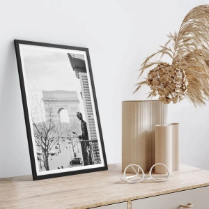 Plakát v černém rámu - Muž na balkóně s výhledem na Vítězný oblouk - 50x70cm - Pokoj s výhledem - Moderní nástěnná dekorace do obývacího pokoje a ložnice ARTTOR