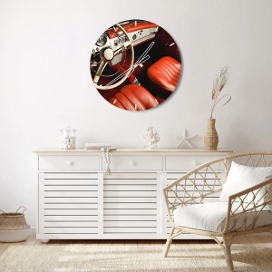 "Vintage Luxury" jsou elegantní nástěnné hodiny zobrazující interiér klasického vozu s červenými koženými sedadly. Tento obrázek kombinuje luxus a vintage styl a vytváří tak jedinečný dekorativní akcent.