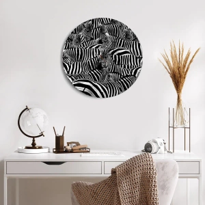 - Tyto kulaté nástěnné hodiny zdobí umělecký obrázek stáda zeber v černé a bílé barvě. Jsou ideální do moderního a minimalistického interiéru, jsou vyrobeny ze skla a měří 30x30 cm v průměru.