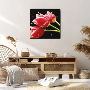 Hodiny jsou vyrobeny z bezpečného tvrzeného skla o tloušťce 4mm. Technologie výroby hodin je v souladu s třídou bezpečnosti 2B2 podle normy PN-EN 12600:2004, která garantuje odolnost proti nárazům. Hodiny na skle jsou připravené k zavěšení – mají kovový závěs upevněný na zadní částí hodin a pěnovou distanční podložku, která upravuje vzdálenost hodin od zdi. Hodiny mají tichý plovoucí mechanismus napájený 1,5V baterií - AA baterie (baterie není součástí balení).